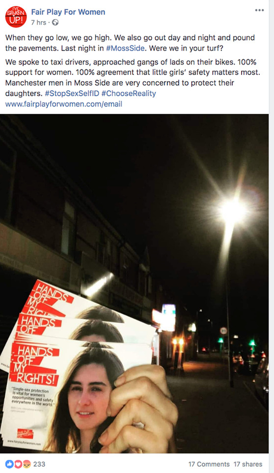 spent £40,000 on a full page ad attacking trans rights in the Metro newspaper, which was apparently funded by US-based conservative Christian groups?Now they’re boasting on fb about encouraging random men and “gangs of lads” to commit violence against trans women.