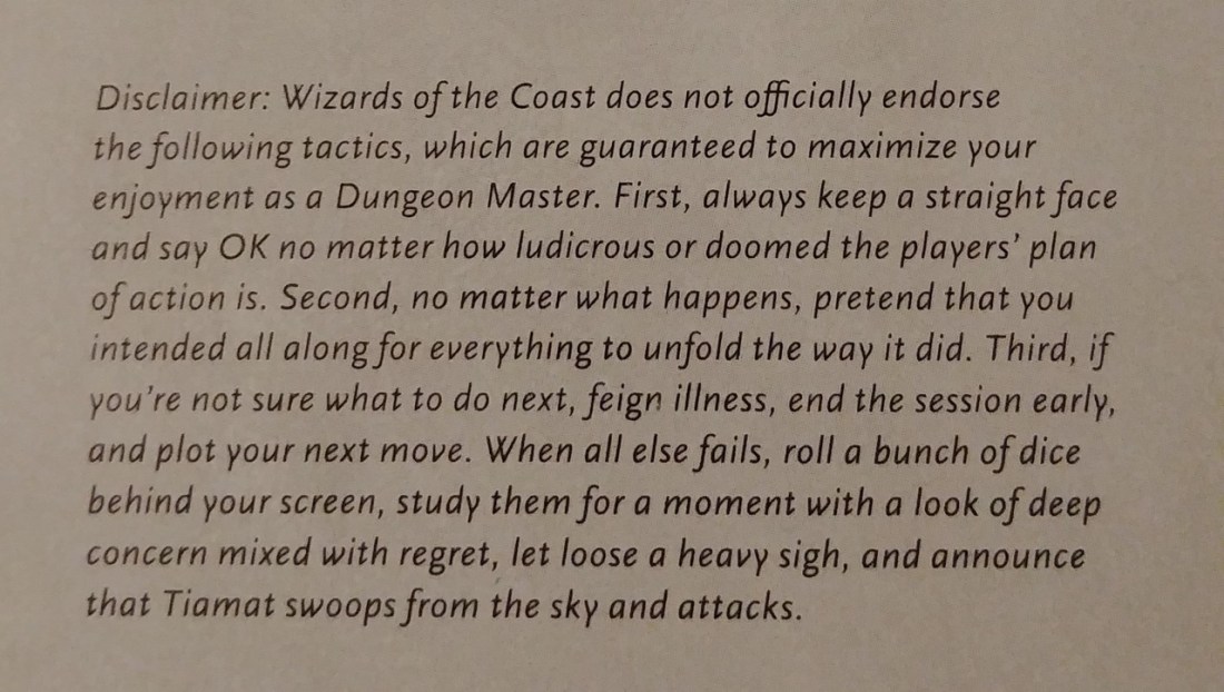 PSA: There are comedic disclaimers in all the 5e books! My favorite is in Xanathar’s Guide to Everything.