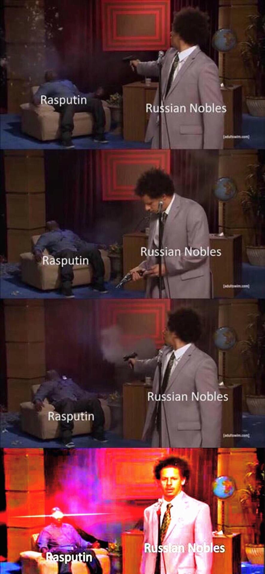 don0303 Uncategorized November 17, 2018December 10, 2018 1 Minute fakehistory: The Dvoryanstvo attempting the murder of Grigori Rasputin (1916) Share this: Share on X (Opens in new window) X Share on Facebook (Opens in new window) Facebook Like Loading... Related Published by don0303 View all posts by don0303 Published November 17, 2018December 10, 2018
